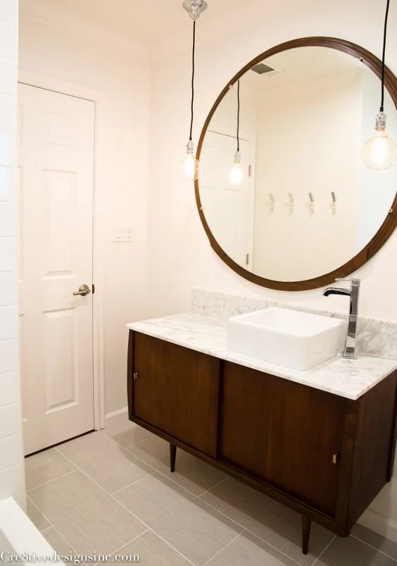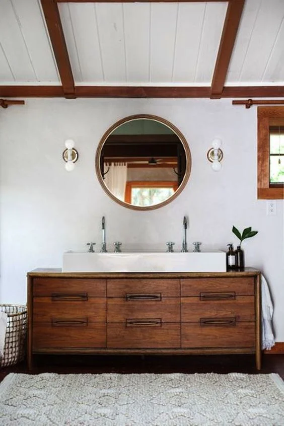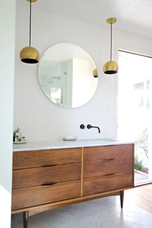 If you're still with me, let's talk about the next steps. In the first post, we drooled over some inspo pictures together. One thing that I've noticed about a lot of the pictures that I really like, are the mirrors. More specifically, the beautiful round mirrors. I LOVE that look. Our bathroom previously had the standard rectangular mirror mounted to the wall with plastic brackets that the previous owner had put in when he added the basement bathroom. It's fine and is perfectly functional, but now that we're doing things over, I want it to be PRETTY! Let's look at some pretty pictures (yay! eye candy!) before I tell you what I did: