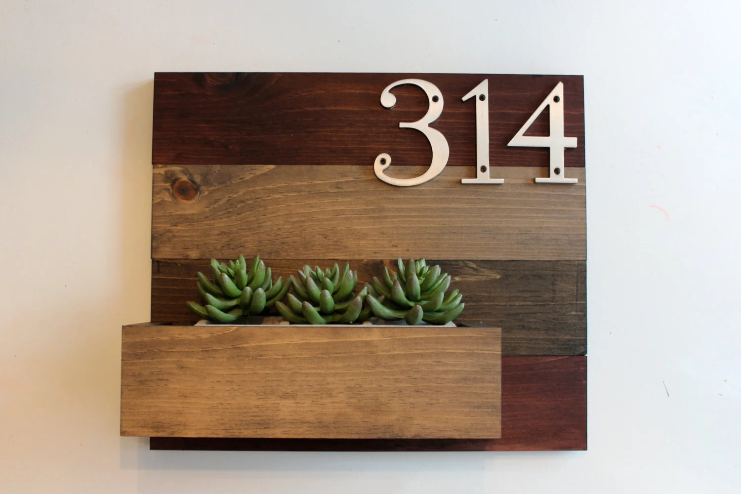 Oooh, if you like the rustic or industrial or even bohemian look, this house number/planter combo above is perfect for you! I love the different stain colors used to give this a striped look! And, in the winter, since your plants would probably die in there (if you live somewhere cold like Michigan), you could always do pretty fake flowers or fake succulents or whatever you want! This one is a maybe for me! Think how pretty that would look next to a coral door!