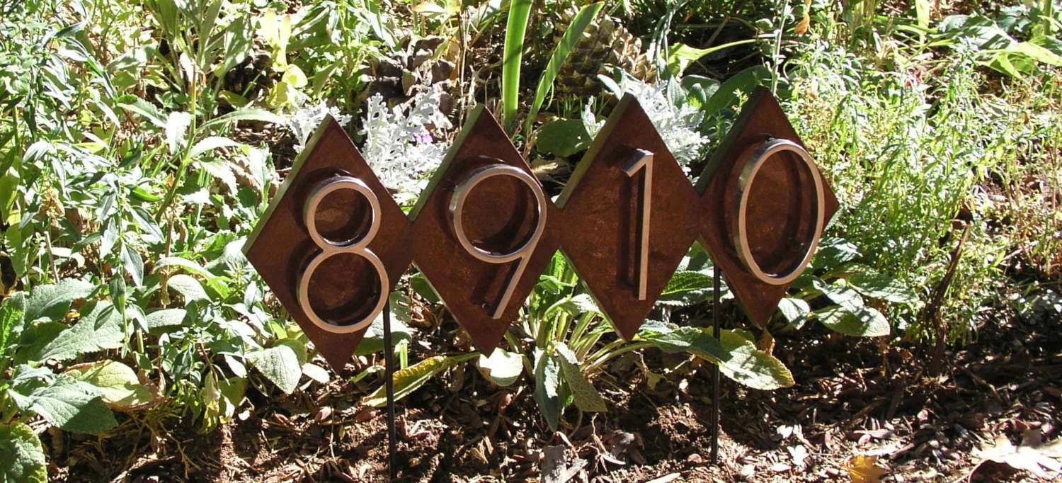 This Art Nouveau style house number above is done in polished copper for the actual number and the background is done in copper with a patina. I love the greenish-turquoise-y color of patinated copper! Think Statue of Liberty.