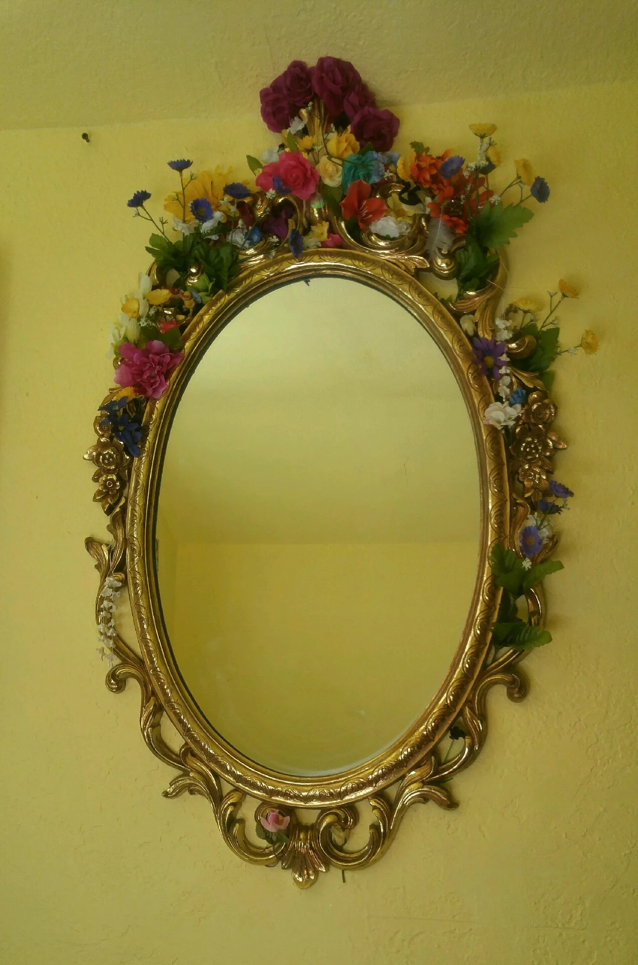 Beautiful vintage mirror + fake flowers = AWESOME!