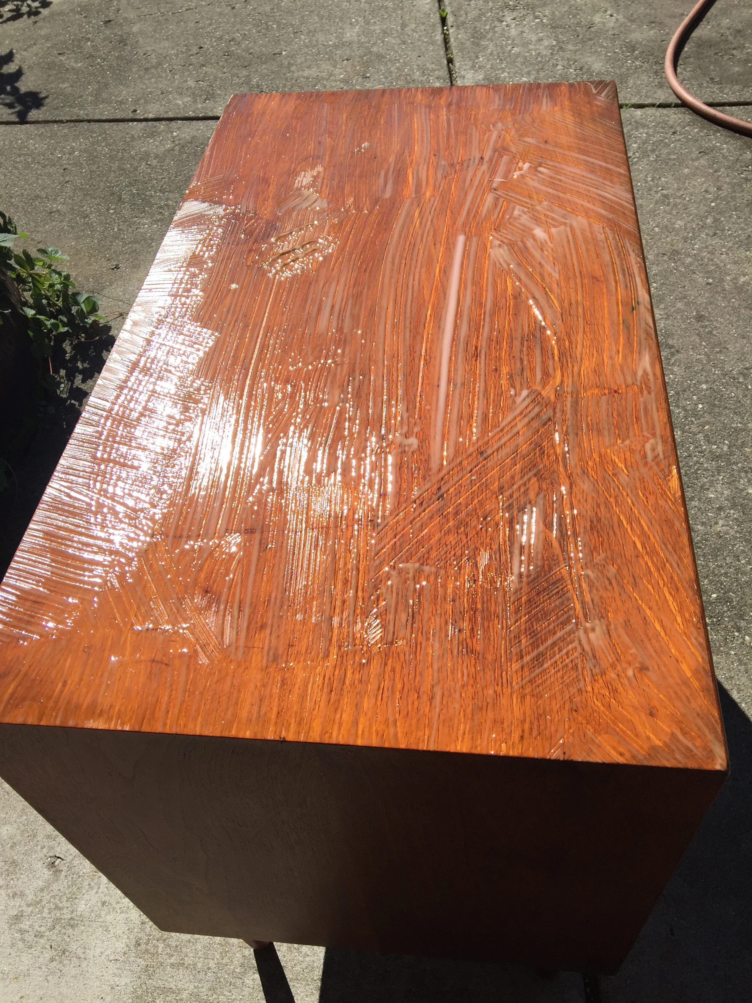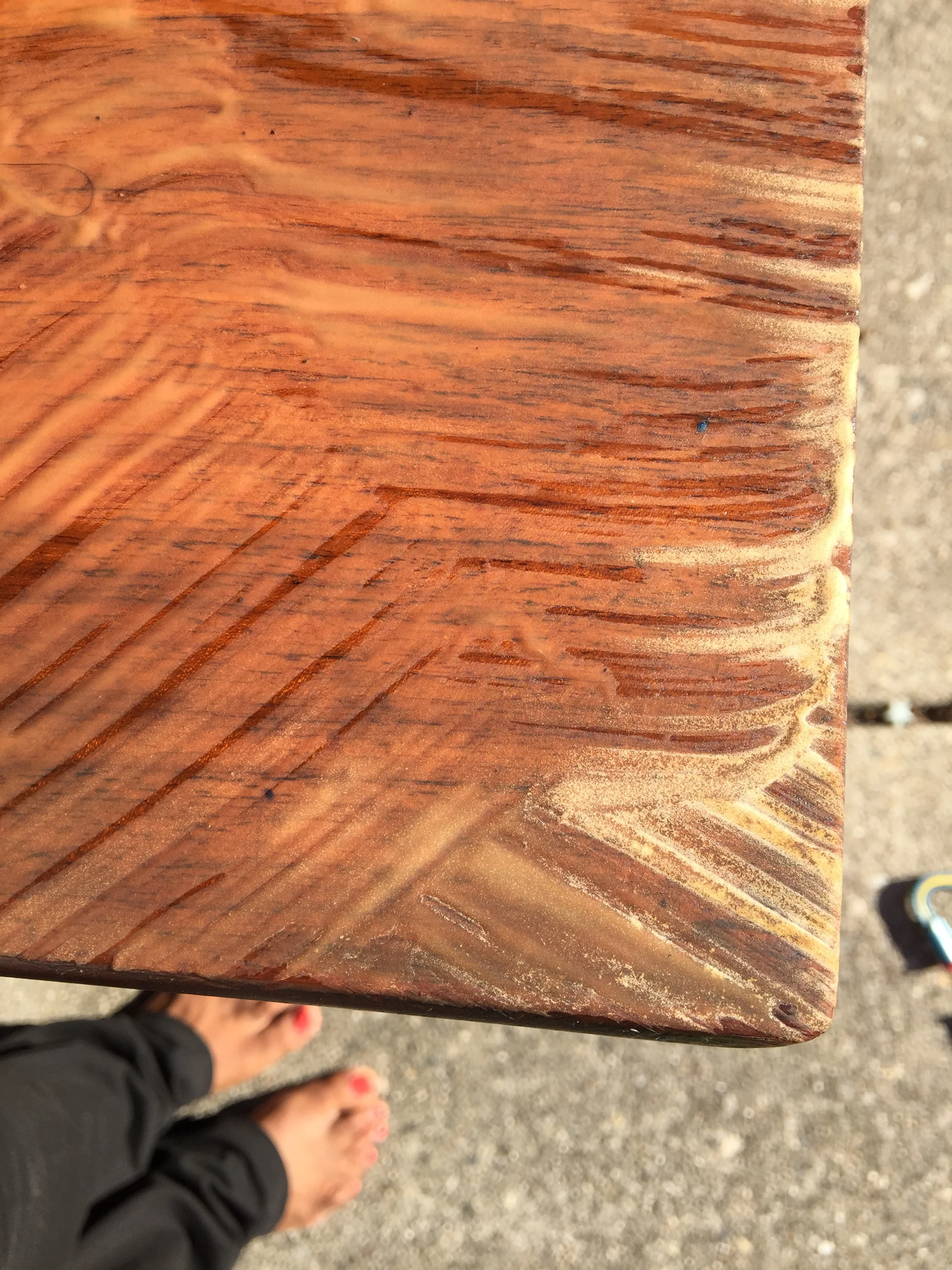 This is what it looks like after all the stripper has been scraped off and now that the surface is dry. Now we sand....