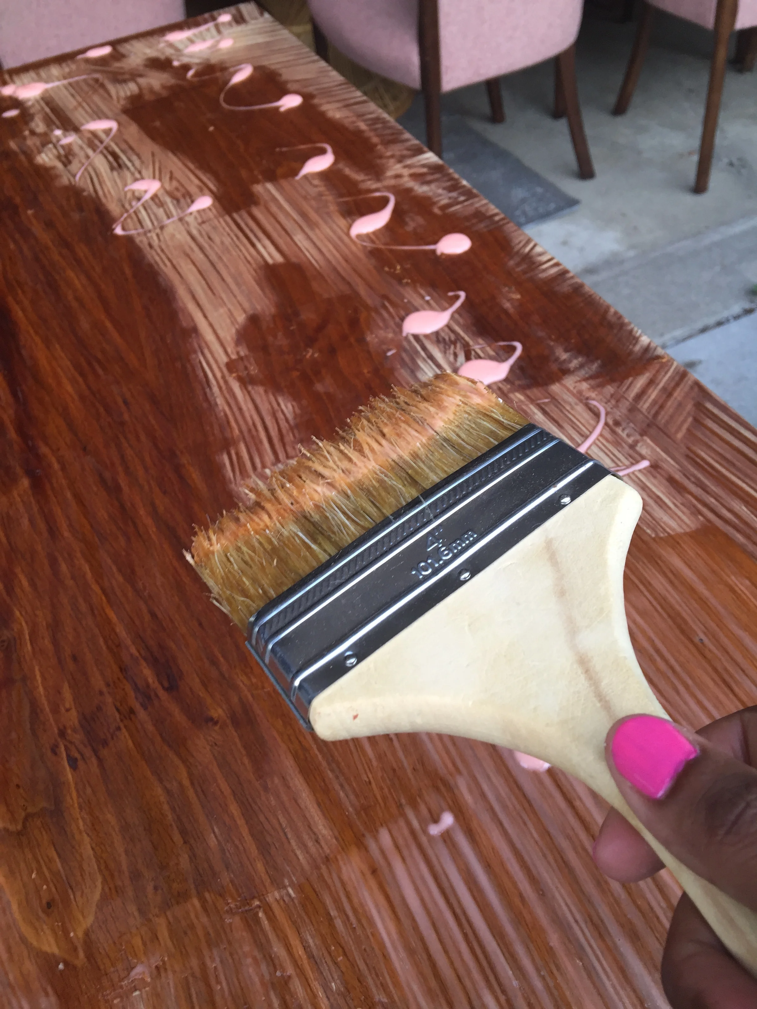 Very slowly stir that poly (not with your brush). You don't want to do it too hard or you will create bubbles in it, which you don't want. Now you're going to dip the paintbrush into the can of poly, and then without taking a ton of it, you're going to "paint" a thin coat of that poly on. You want to do this as SMOOTHLY as possible. If you get bubbles, they will dry as bumps in the finish. If you do get some bubbles, don't freak out about it because you are most likely going to do a 2nd coat of poly with some sanding in between (yay....more sanding....womp womp), but still try to do the best job you can. Now let that thing dry (read the can for the number of hours - but usually 3-4). And go have a drink in the meantime (if you're not already woozy from the smell of the poly).