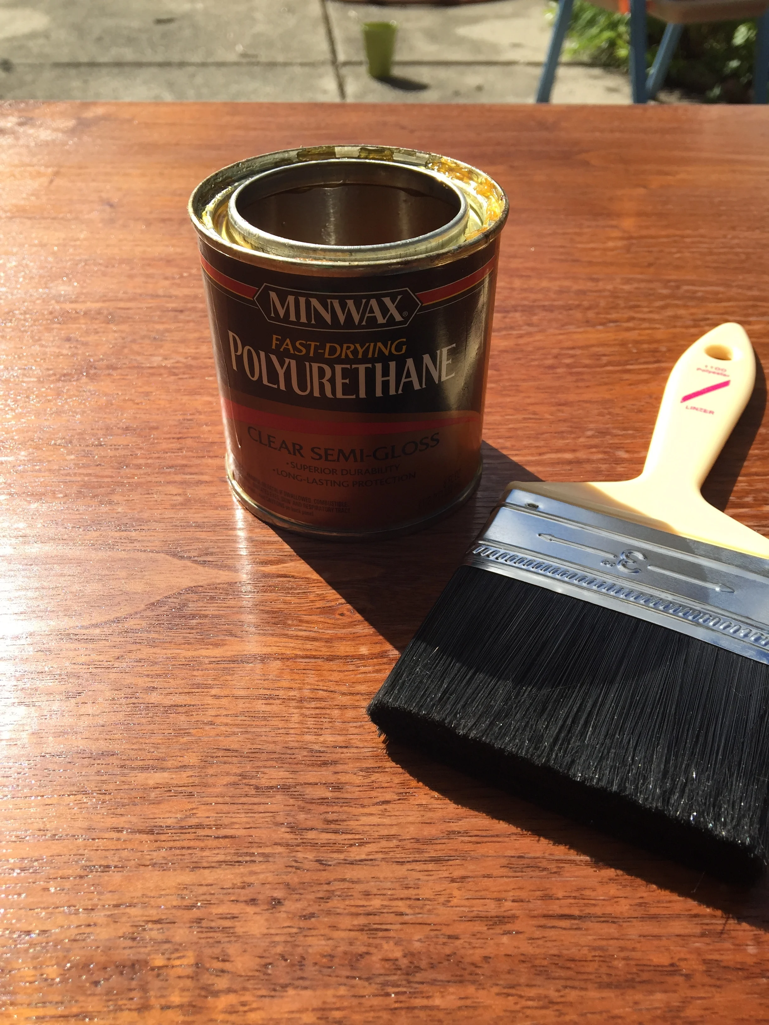 9. Time to make it shiny! Or matte. Either way, now we protect that wood. After waiting the recommended number of hours before doing this step (again, look at the stain can), you get to do the tricky and sometimes frustrating part . DO THIS IN A WELL-VENTILATED AREA UNLESS YOU WANT BRAIN DAMAGE. Was that dramatic enough? You are going to take your polyeurethane, and a high quality brush to do this step.
