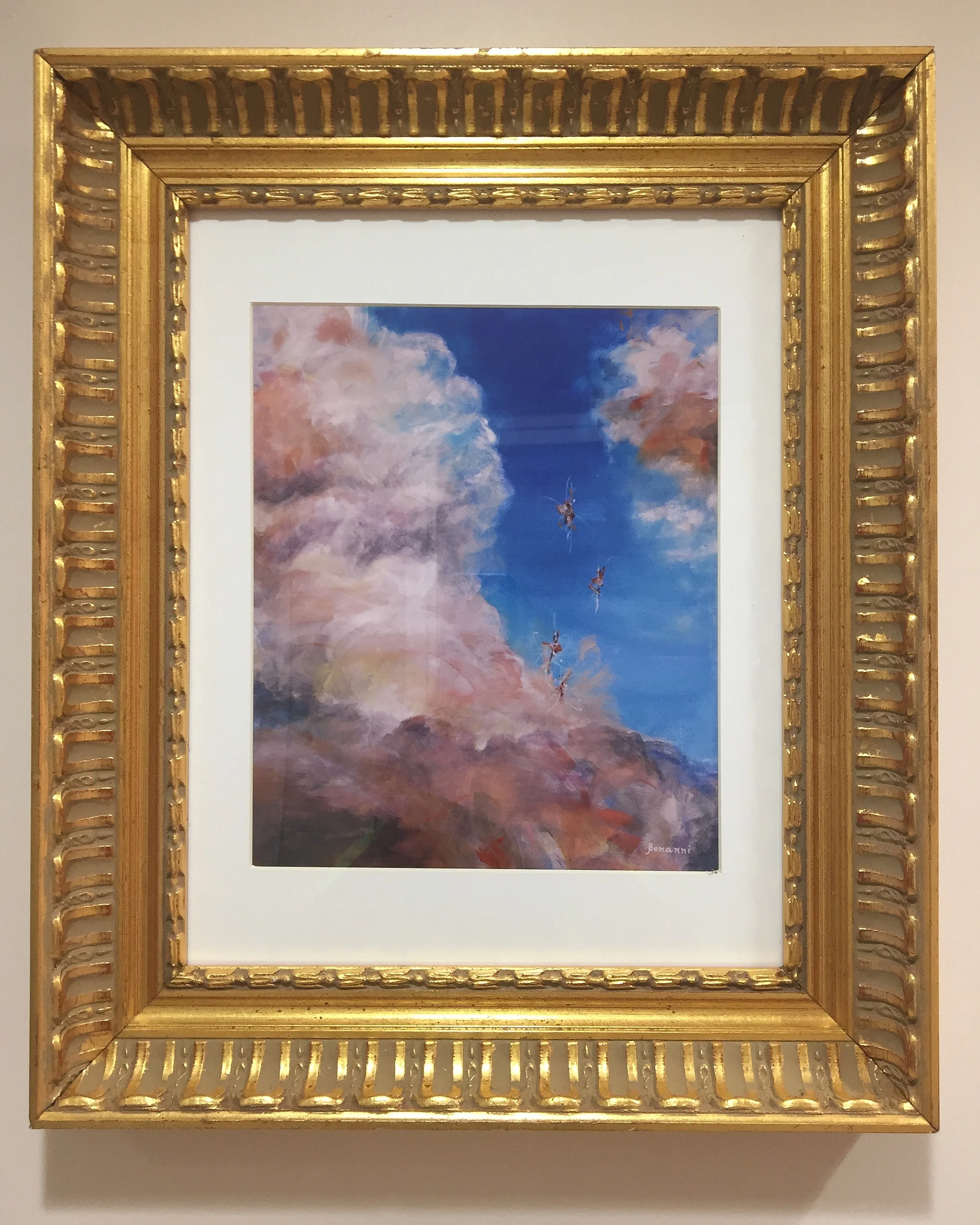 So, backing up a little, you can see what I did kind of near the door. When you first walk in, there's a builder grade enclosed shower stall (yawn, but whatever) on your right. I didn't take a picture of it because it's just boring and nothing new happened with it (but you can see it in the mirror). On the left when you walk in is a plain wall. I didn't take a picture of that either because there's nothing on it. I haven't decided what's happening with it and probably won't until I have some free time in 13.5 years. But, right after that short wall on the left, another bit of wall angles off. In case you haven't noticed, there are lots of wall surfaces because this room wraps around the furnace room - gotta love basement rooms). Anyway, so this wall is where I would have put the Anthro towel bar if it had worked out (I'll explain that in a minute), but since it didn't I decided to just make it pretty and put up some art. Now, I'm pretty lucky in this department because Nick owns a lot of art and is a super talented painter himself. I picked out a print of a painting he did a long time ago and which is one of my faves of his. He gave the original away to a friend long before I came along. :( Anyway, so he also has lots of frames and knows how to frame art, so, this was his project. You can see all this below.