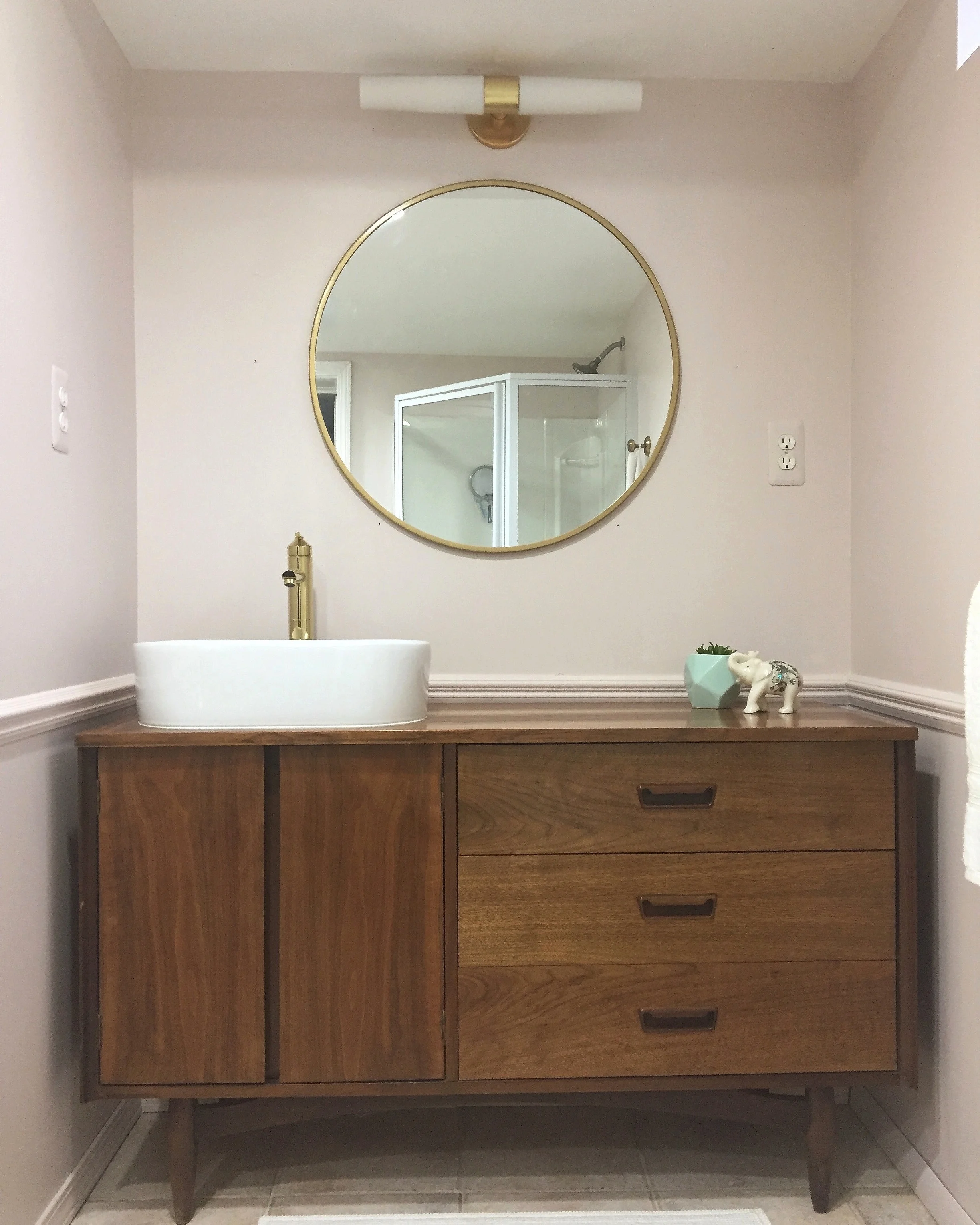 Yay! I get my mid-century modern credenza-turned-vanity, and my round mirror, my brassy light fixture, and my obnoxiously gold faucet! LOVE! I'm so happy to have our second bathroom functional again. SOOOOO nice, especially with 2 small kids that ALWAYS have to use the bathroom RIGHT when I do! I'm pretty sure they do this on purpose just so they can watch my reaction when they tell me this. Bathroom business in peace is a luxury that you take for granted until you have little ones! TMI? whatevs.