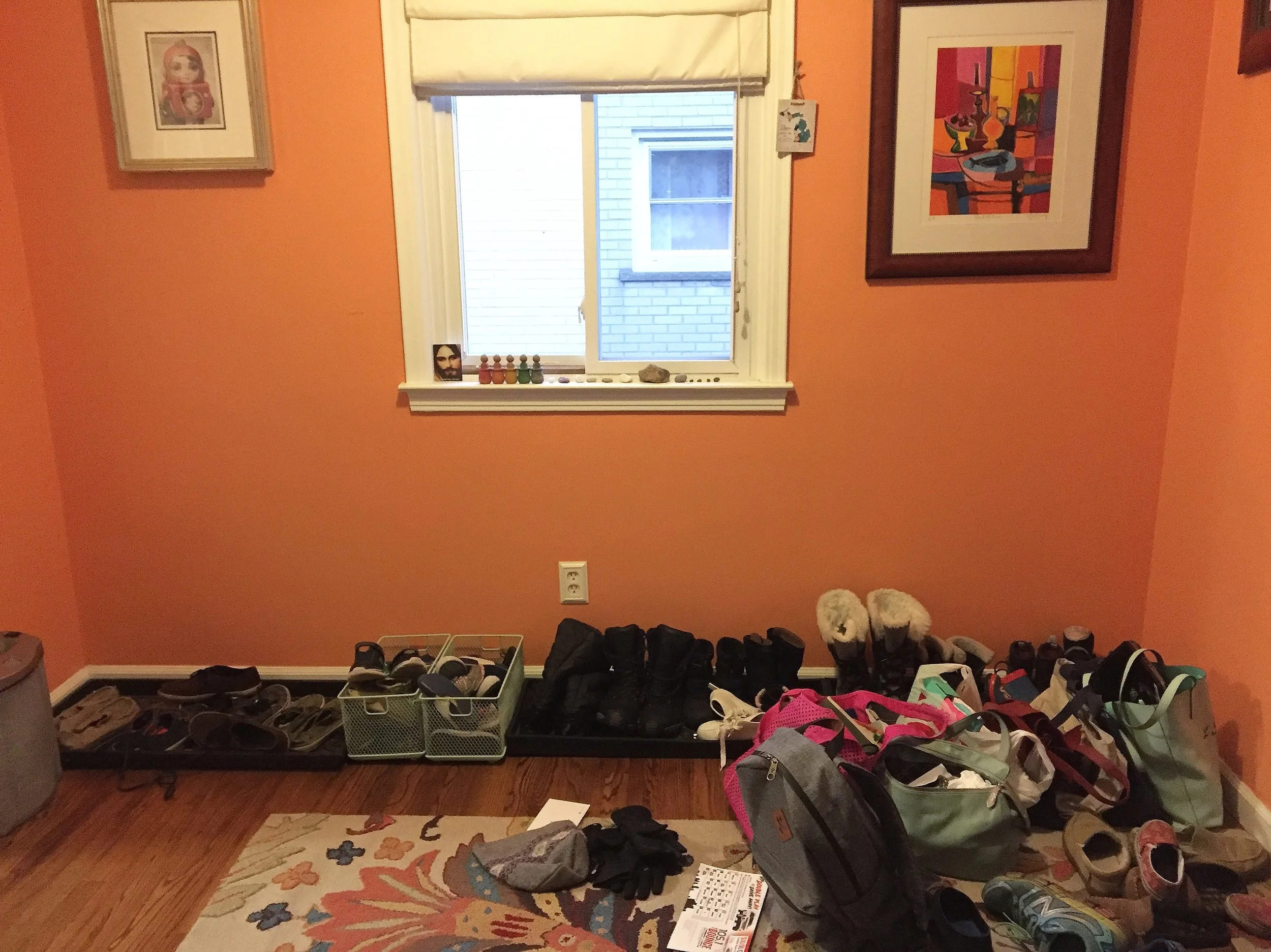 This area cleaned up really nice for pictures and company, , on an every day life basis, it was just not working. When people weren't coming over, and I wasn't doing the mad dash to make everything look neat and styled (read: fake), it was a total clusterf of coats all over and shoes and boots and school bags and work bags and purses. See below for what it would look like when I would clean up for company or to take a picture for Instagram (aka fake reality).