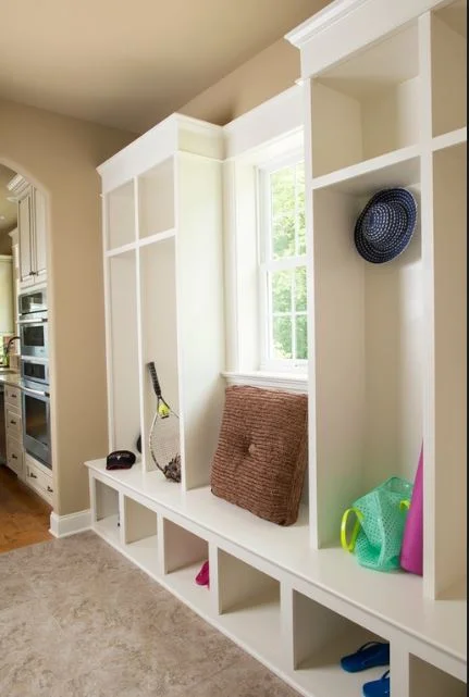 Okay, so what's the plan? We wanted built-ins! And by "we", I mean,"me". I had dreams of Pinterest-worthy mudroom built-ins! Cue the angel choir. And my perfect little Pinterest children would hang up their perfect little coat and rainboot sets and a bunch of perfect little throw pillows would complete the scene. I found tons of pictures online for inspiration. Almost none of them set in little 1950s dollhouse ranch houses of course. But then I found this: