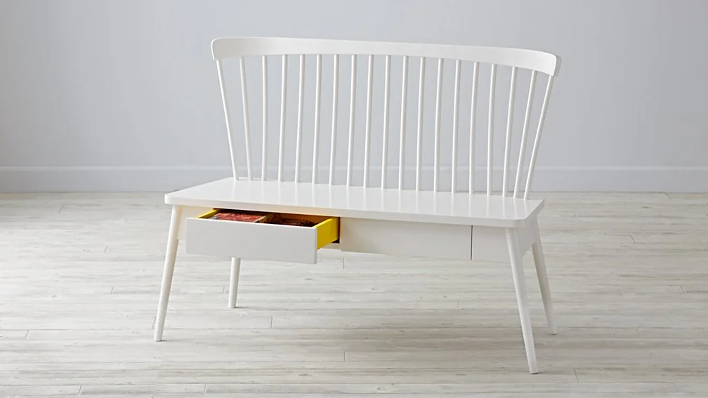 Homestyle Bench by Land of Nod - $299 - Super cute! and the size of it would make it fit under that window with just a couple inches sticking out on each side. So, it's kind of small. And it's a kid's bench, and not made in America because it's from a big box online store...sigh. Okay. Plus, $300 for something that little, plus shipping, probably not. But, it is super cute, especially with those yellow drawers!